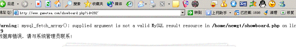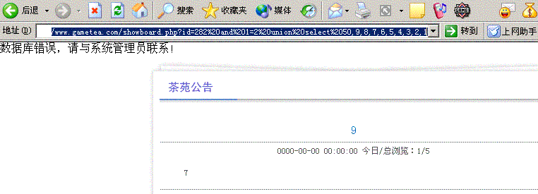 构建语句http://www.gametea.com//showboard.php?id=282%20and%201=2%