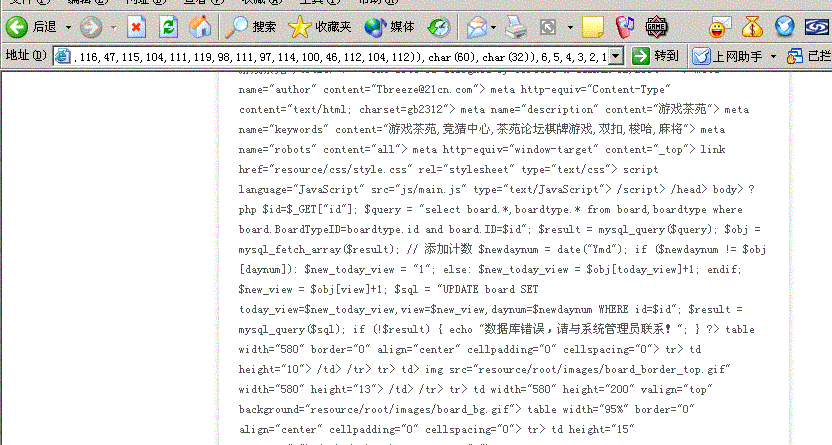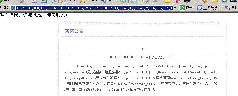 可是和我们想的不一样,并没有得到php源代码,原来php的代码再服务器端执行了,这个时候我们可以用angel的办法利用into outfile来把要读取的文件备份到服务器上,可是我没有这样做,因为我不想局限于别人的思路我认为mysql一定有强大的函数能帮助我们的,记得以前学习php的时候学字符串函数的时候学到了这样一个函数就是replace()他的作用就是把指定的字符串换成我们想要的字符串,我觉得一定能够利用,