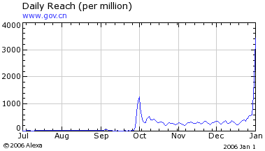 正式开通首日是元旦假期,虽然政府网的主要浏览者机关工作人员在节日期间不上班,但中国政府网当日点击率为4048万,页面浏览量为519.5万,访问人数为33.79万,访问人次为25.6万。
